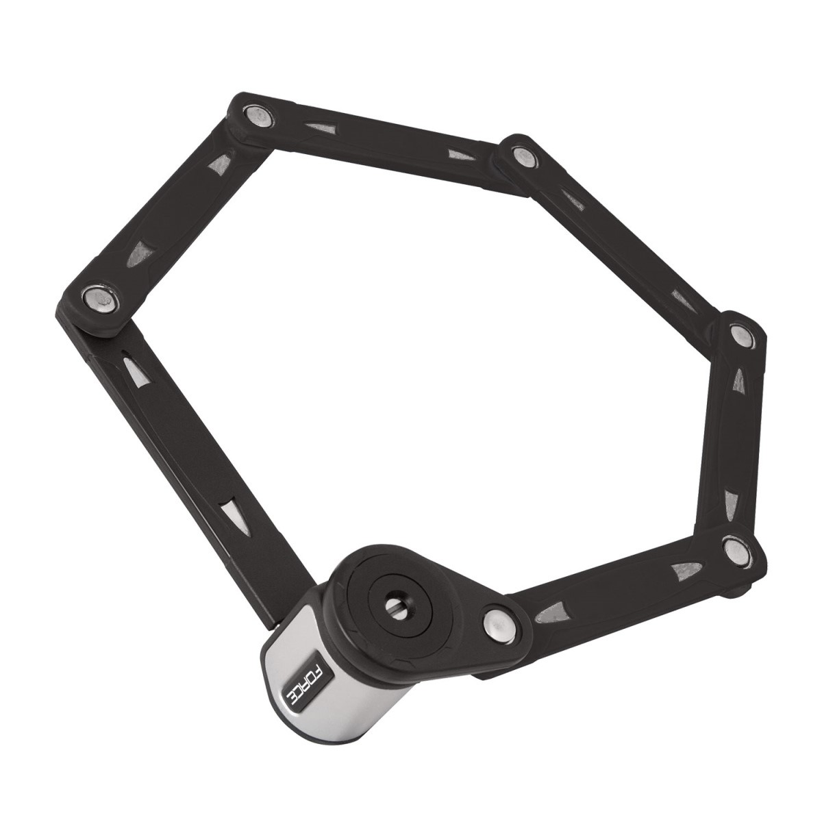 skládací zámek FORCE FOLD černý včetně držáku délka: 80 cm, 6 článků rozměr 1 článku: 22,8 mm x 7,2 mm x 138,5 mm uzamykání na klíček, 2 ks klíčků hmotnost: 1 kg baleno na kartě FORCE